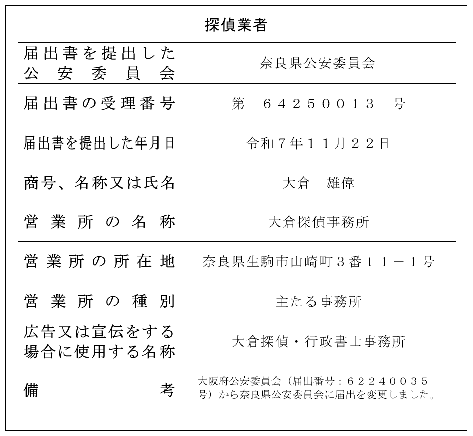 その経験から、探偵業務の届け出を行い、法的実務と調査を一体的に提供できる体制を構築するに至りました。